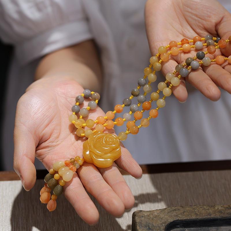 |Name|Golden Silk Jade Round Bead Rose Flower Necklace