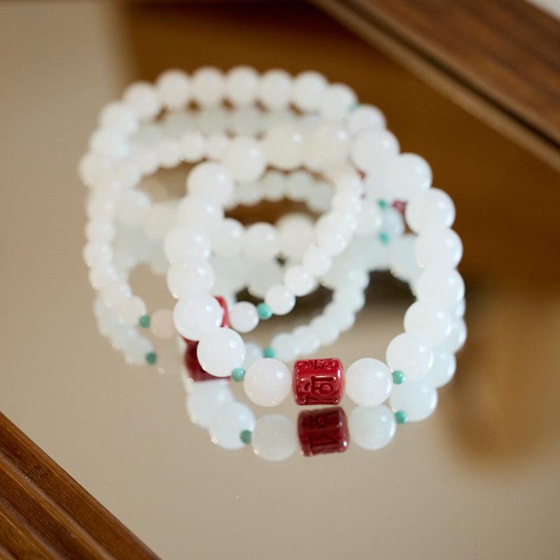 Hetian White Jade Bracelet for Women with Cinnabar Six-Word Mantra, Jadeite Hetian Jade Beads, Zodiac Year Gift